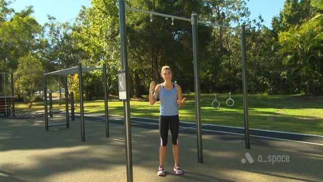 - Jump or step up until your arms are fully extended, elbows locked, and rings beside your hips.