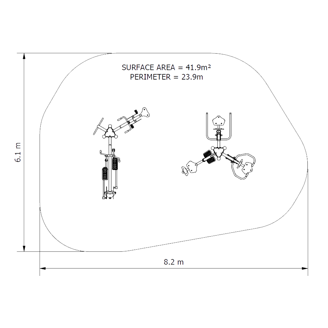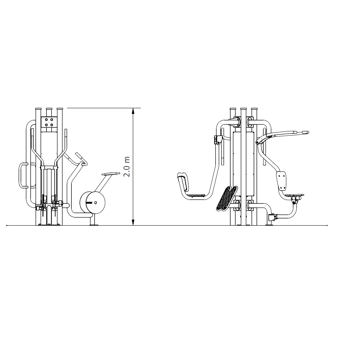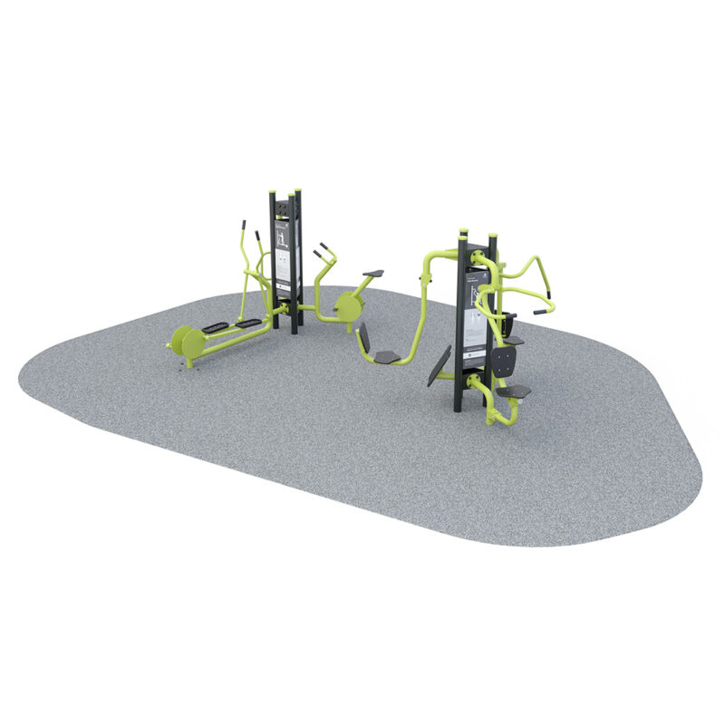 Our Aerobic & Strength Builder Circuit is a versatile outdoor fitness circuit combining chest press, leg press, stretch station, elliptical trainer, aerobic cycle and pull downs to deliver a full body strength and cardio workout in a single integrated unit.