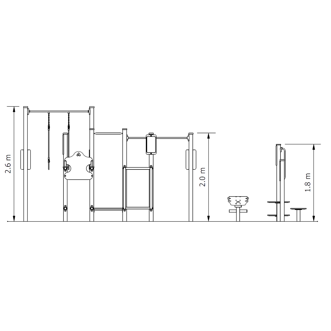Our 7 Station Challenge is an intermediate to advanced outdoor fitness circuit with seven functional stations including gorilla bars, Roman rings, body dips, leg raises, sit up bench and step up station that deliver a varied strength and mobility workout for users aged 12 and up in parks and community spaces.