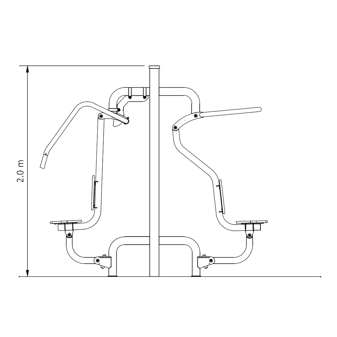 Chest Press develops upper body strength. The level of effort can be increased by lifting one or both feet off the ground while performing the exercise.