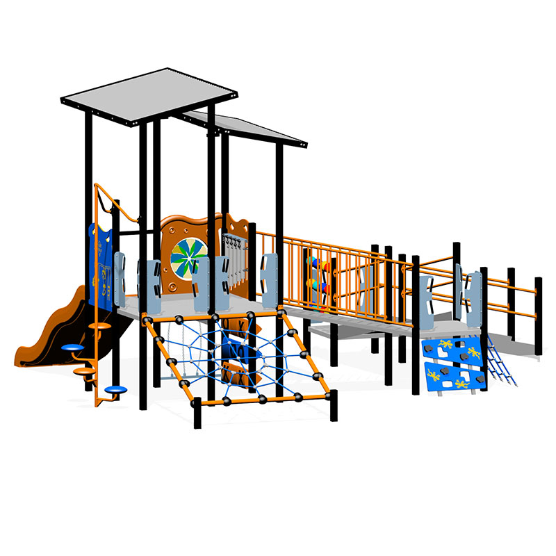 This accessible playground has many low elements for younger children such as the Tic Tac Toe, Abacus and Squeeze Panels as well as a Xylophone and Clock Panel on the higher levels. The playground is easily accessible for toddlers, new walkers and kids in wheelchairs who have new play elements on each level. We have also added an Inclined Web, Cliff Climber, Rung Climber and Step-Up Pole for the kids who like a bit more of a challenge.