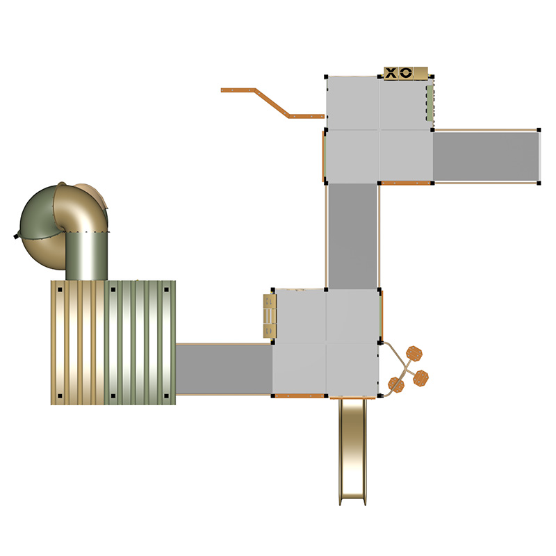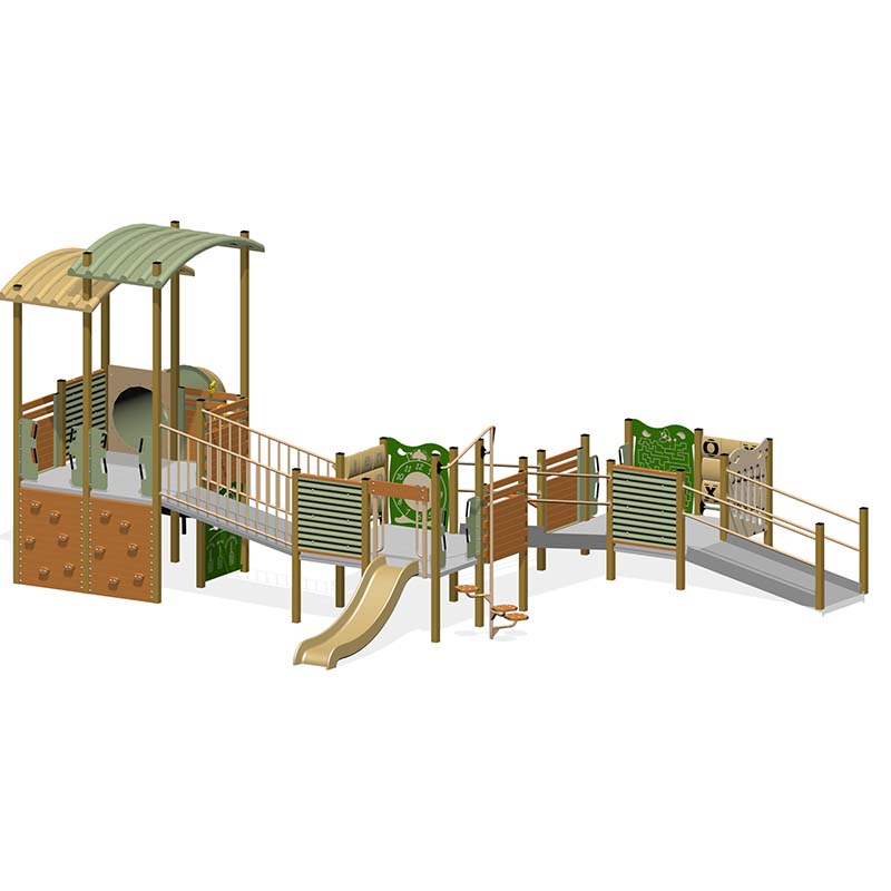 This accessible playground has 3 long ramps to get to the top of the fort. The first level has a Xylophone, Tic Tac Toe and a Maze Panel. The Second Level has a Word Panel and a Clock Panel and the third level has a Steering Wheel and a Telescope at the top of the fort. We’ve also included epic Spiral and Straight Slides, Timber Stepper Pole, a Balance Beam, and 2 Rock Walls and a Steer N Gear Panel to make a cubby under the fort! The playground is easily accessible for toddlers, new walkers and kids in wheelchairs with new play elements on each level.