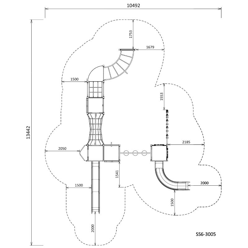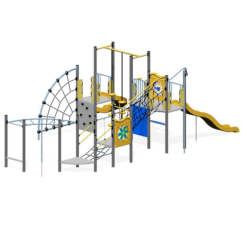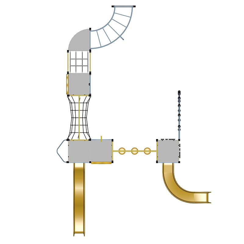 This compact playground is chock full of climbing elements. Curved Monkey Bars, Arched Web, Pommel Joiner, Clock Panel, Rock Wall, Shop COunter and Shop Shelves, as well as a Wave and Curved Slide and a Fire Pole and this playground, has something for everyone.