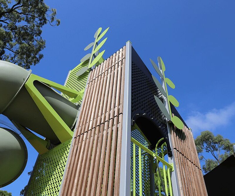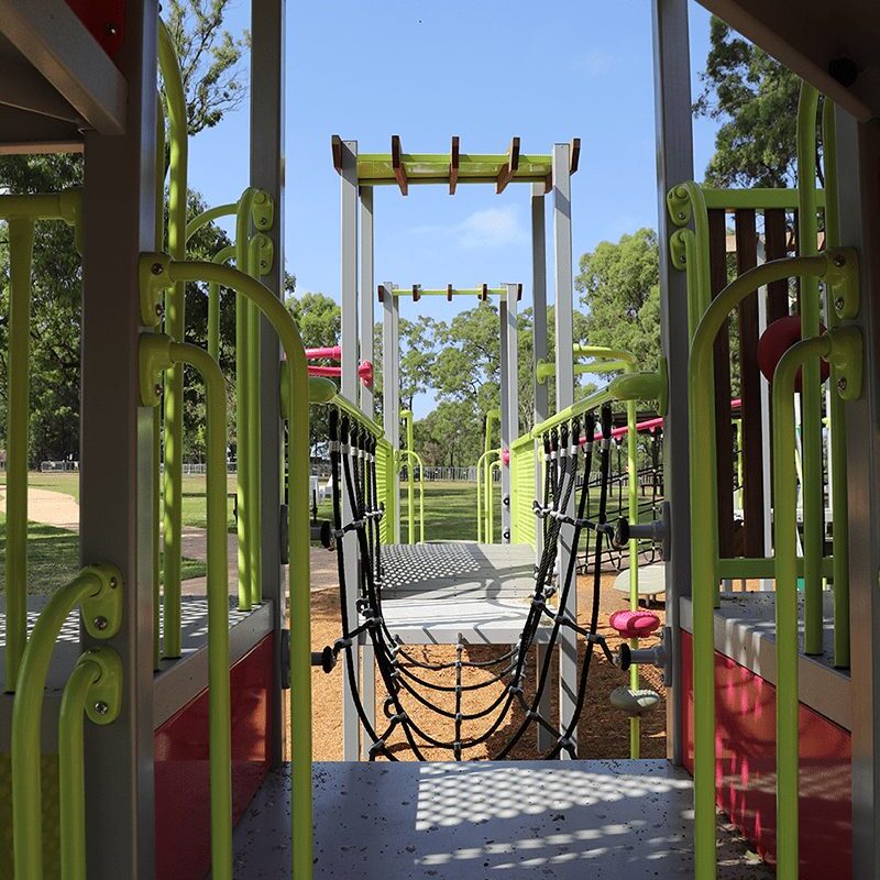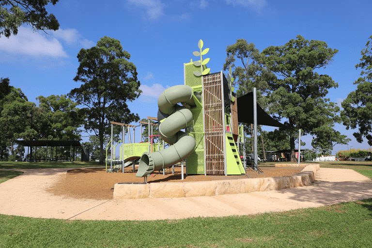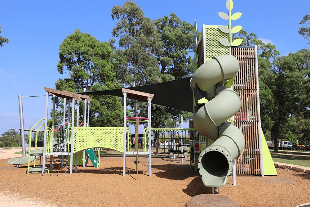The Bella Vista Farm NSW project delivered a standout community playground centred around a striking tower with slides, swings, climbing nets, stepping stones and a whirly-go-round that’s become a key play destination in the park.