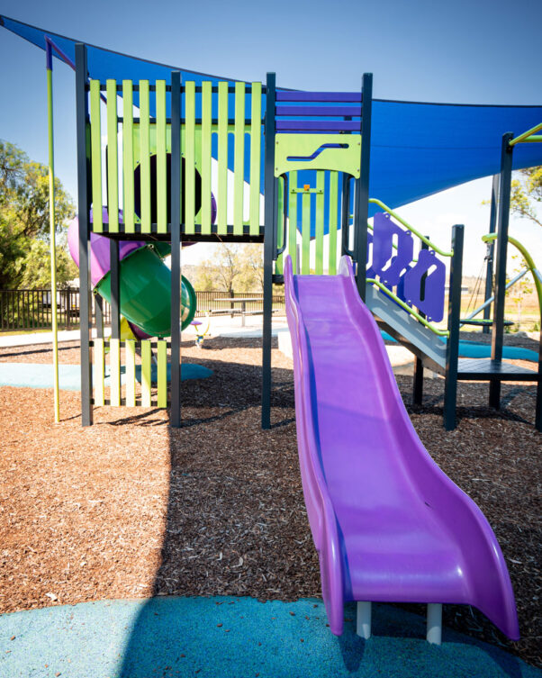 Built by us to inspire joy and fun, the play space sits right next to the tennis court and features a shade sail for all-weather comfort. Bright pops of purple and yellow make the playground a visual standout, while a mix of engaging equipment – including a rocket, slide, basket swing, and an inviting play structure – offers endless opportunities for fun.
