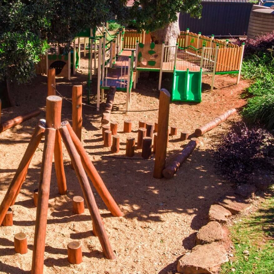 This playground features our nature play brand, Natura. All Natura play elements are made to order. They are hand-finished original pieces, with no mass production. We use sustainably-sourced natural logs, typically ironbark, which are de-barked, sanded, radiused and oiled, then finished with bitumen-sealed footings. Explore the range here.