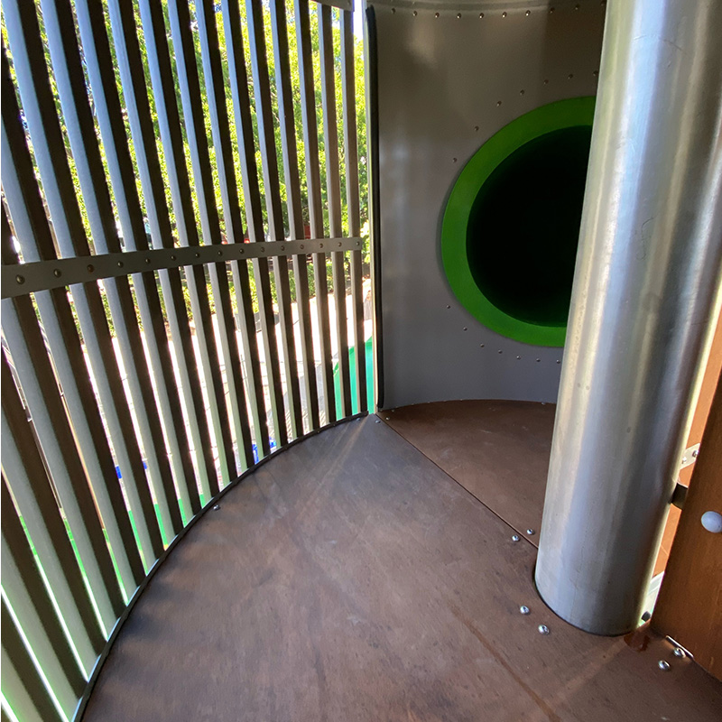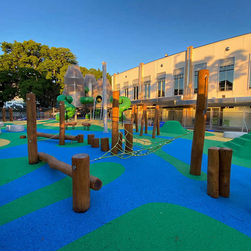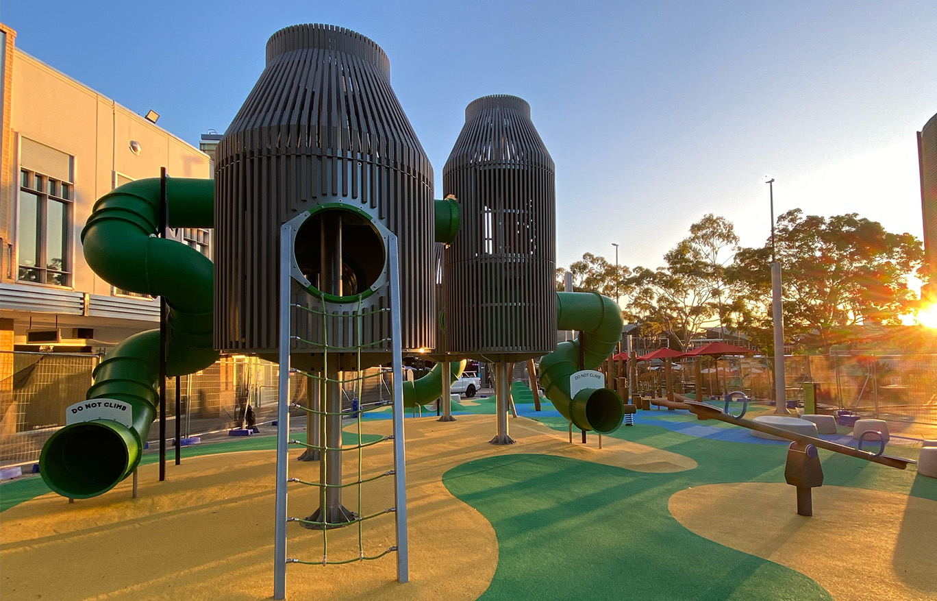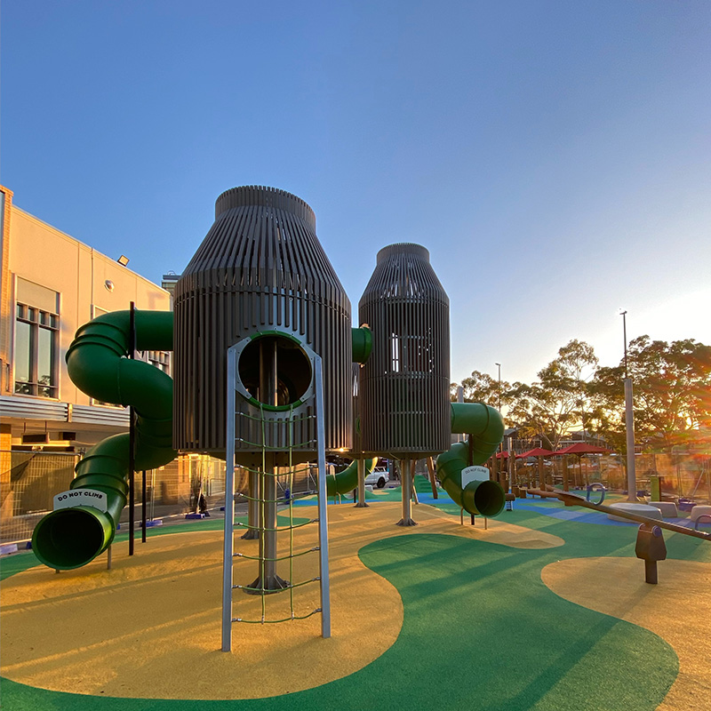 Our design team rose to the challenge with these sky-high play towers that provide endless opportunities for kids to climb, slide and explore while maximising floor space and street appeal. We used a mix of timber and recycled plastics to make a more sustainable space that complements the surrounding parklands. Play areas are zoned by ability and intent, so toddlers enjoy cognitive and sensory activities at ground level while more adventurous kids explore and build confidence up high.